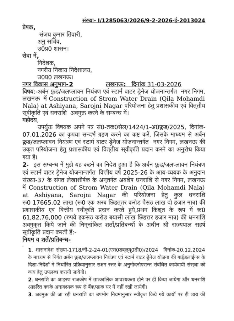 अर्बन फ्लड कंट्रोल एवं स्टॉर्म वॉटर ड्रेनेज योजना के तहत किला मोहम्मदी ड्रेन की रीमॉडलिंग से सरोजिनी नगर क्षेत्र में जल निकासी की मजबूत और आधुनिक व्यवस्था विकसित की जाएगी। इससे आशियाना समेत आसपास के हजारों परिवारों को हर वर्ष होने वाली जलभराव की समस्या से राहत मिलेगी।