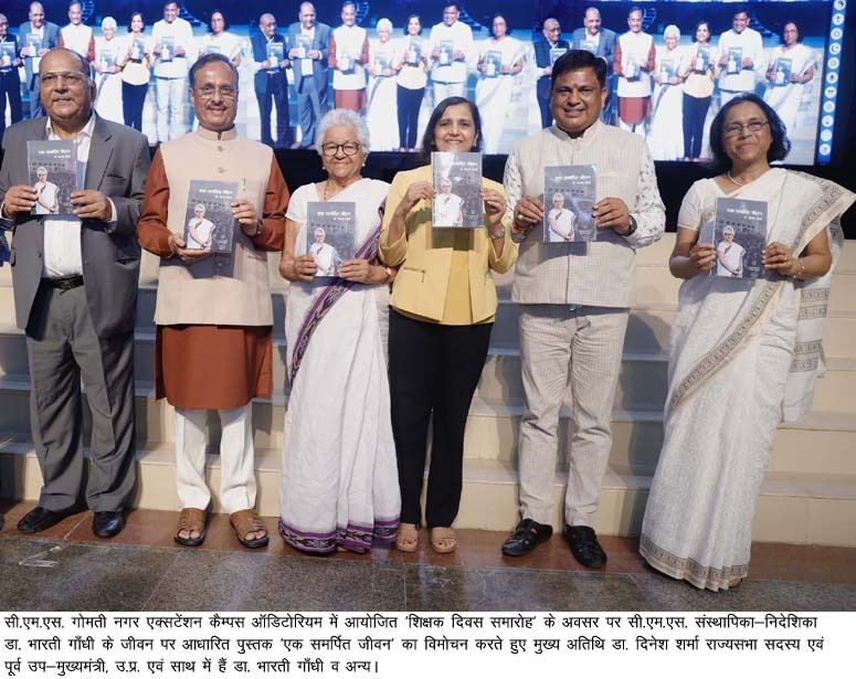सी.एम.एस. संस्थापिका-निदेशिका डा. भारती गाँधी के जीवन पर आधारित पुस्तक ‘एक समर्पित जीवन’ का विमोचन इस अवसर पर खास आकर्षण का केन्द्र रहा। मुख्य अतिथि डा. दिनेश शर्मा एवं मंचासीन विशिष्ट अतिथियों ने रिबन खोलकर पुस्तक को जनमानस हेतु लोकार्पित किया। इस अवसर पर वक्ताओं ने एक स्वर से कहा कि यह पुस्तक भावी पीढ़ी को नई राह दिखाने वाली प्रेरणादायी पुस्तक है। इस अवसर पर सी.एम.एस. की संस्थापिका-निदेशिका व प्रख्यात शिक्षाविद् डा. भारती गाँधी ने सभी के प्रति हार्दिक आभार व्यक्त किया। सी.एम.एस. के कम्युनिकेशन विभाग के हेड श्री ऋषि खन्ना ने बताया कि शिक्षक दिवस के उपलक्ष्य में सी.एम.एस. शिक्षकों व कार्यकर्ताओं ने विशाल ‘चरित्र निर्माण मार्च’ निकालकर भावी पीढ़ी के चरित्र निर्माण का जोरदार संदेश दिया।