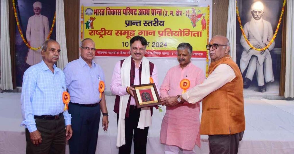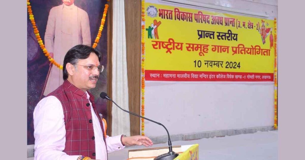 लखनऊ: रविवार को राजधानी लखनऊ के गोमतीनगर स्थित महामना मालवीय विद्या मंदिर इंटर कॉलेज में भारत विकास परिषद द्वारा प्रांत स्तरीय ‘राष्ट्रीय समूह गान प्रतियोगिता’ का आयोजन किया गया। कार्यक्रम में बतौर मुख्य अतिथि पहुंचे सरोजनीनगर विधायक डॉ. राजेश्वर सिंह ने प्रतिभागियों का उत्साहवर्धन और मार्गदर्शन किया। डॉ. सिंह ने भारत विकास परिषद के प्रयासों की सराहना करते हुए कहा कि पर्यावरण संरक्षण, ग्रीन और क्लीन एनर्जी को बढ़ावा देने के प्रयासों के प्रति जागरूकता फैलाने के भारत विकास परिषद के प्रयास सराहनीय हैं। परिषद द्वारा संचालित चिकित्सा व्यवस्थाओं और स्वास्थ्य सेवाओं को डॉ. सिंह ने अनूठी मिसाल बताते हुए कहा जितना ज्यादा स्वास्थ्य के प्रति जागरूकता होगी देश उतना ही आगे बढ़ेगा। युवा वर्ग जितना स्वस्थ होगा उतना बेहतर प्रदर्शन करेगा।