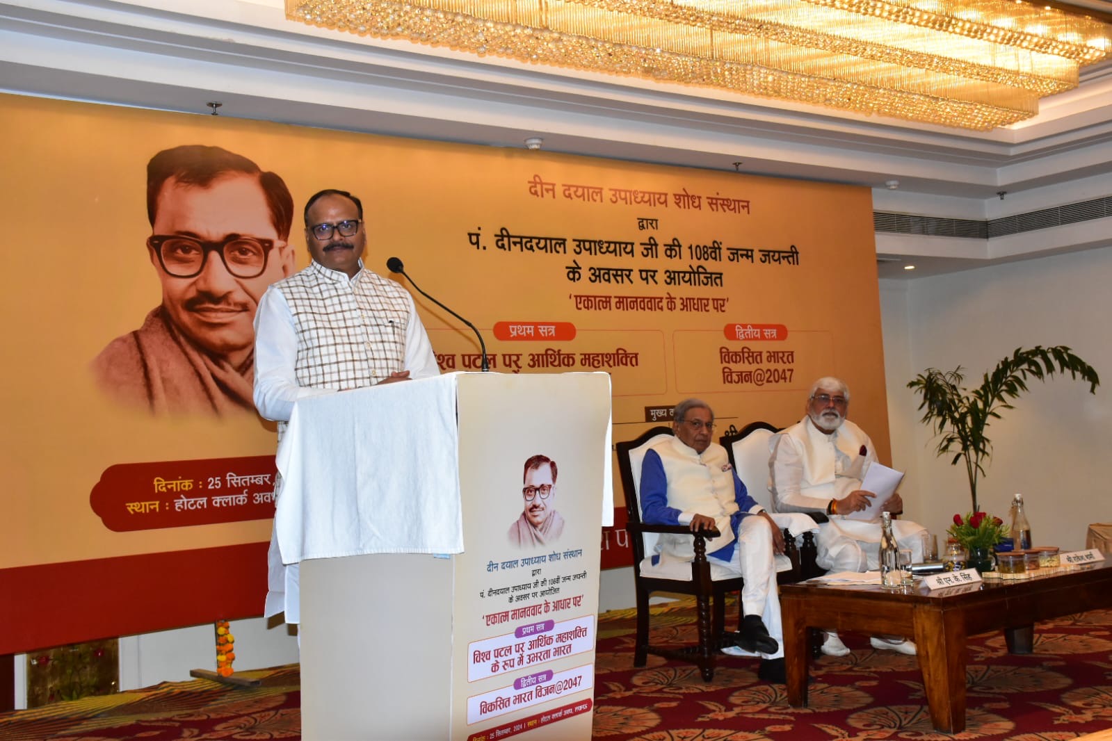 डिप्टी सीएम बुधवार को दीन दयाल उपाध्याय शोध संस्थान द्वारा आयोजित कार्यक्रम को संबोधित कर रहे थे। होटल क्लार्क अवध में दो सत्र में हुए कार्यक्रम की शुरुआत पं० दीनदयाल उपाध्याय जी के चित्र के समक्ष दीप प्रज्ज्वलित कर हुई। प्रथम सत्र में 15 वें वित्त आयोग के अध्यक्ष एनके सिंह ने विश्व पटल पर आर्थिक महाशक्ति के रूप में उभरता भारत पर व्याख्यान दिया। उन्होंने कहा कि प्रधानमंत्री नरेंद्र मोदी पंडित दीन दयाल उपाध्याय की विचार धारा को आगे बढ़ाते हुए भारत को नई दिशा दी है। गरीबों के हितों में काम किया। यही नहीं प्रधानमंत्री ने मुझे फिजिकल रिस्पांसब्लिटी कमेटी का उत्तरदायित्व सौंपा था। जिसे मैंने पूरी क्षमता से पूरा किया। कमेटी की रिपोर्ट सदन के समक्ष पेश की गई। सदन ने उसे स्वीकार किया। उन्होंने कहा कि केंद्र व राज्य मिलकर काम करें। गरीबी को खत्म करें। योजनाओं को लागू करें। तभी विकसित भारत की परिकल्पना पूरी होगी।