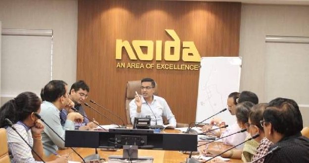 नोएडा प्राधिकरण केबोर्ड रूम में डीएनजीआईआर को लेकर बैठक करते प्राधिकरण के सीईओ लोकेश एम व अन्य अधिकारी।