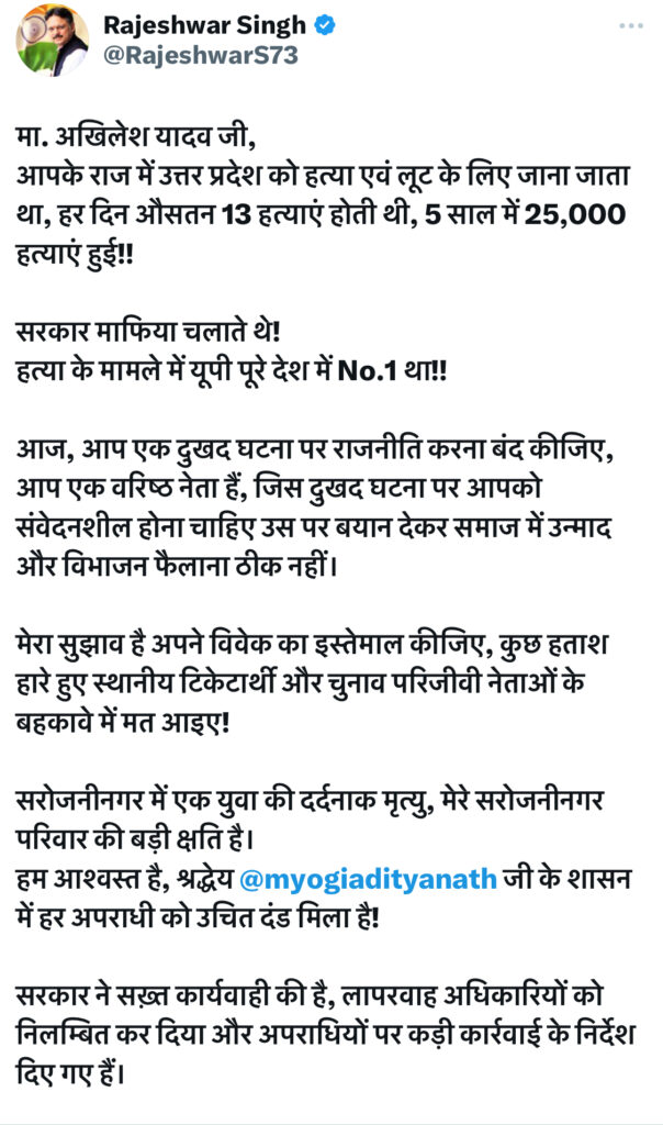 • ⁠अखिलेश सरकार में तो माफिया ही सरकार चलाते थे और हत्या के मामले में उस वक्त यूपी पूरे देश में नम्बर-1 था- डॉ०राजेश्वर सिंह
